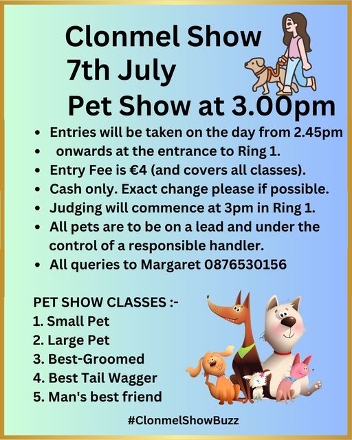 Get ready for a parade of personality and a showcase of cuteness. Let’s unleash the fun! Welcome to the Pet Show at Clonmel Show on Sunday 7th July at 3.00pm.